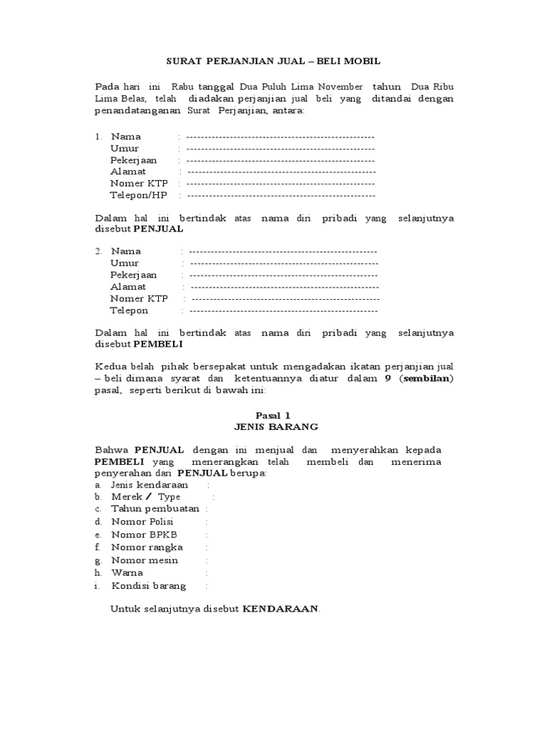 Contoh Surat Perjanjian Jual Beli Mobil Sederhana Lengkap Pdf